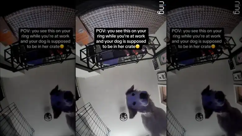According to the video, Rosie was "supposed to be in her" metal dog crate, but the door fell off, allowing her to freely roam the house. The camera was positioned near the crate, and as soon as her owners saw her walking around, they told her she had some 'splaining to do through the camera. They're heard telling her to go to her crate, asking her what she's doing, and asking how she escaped. Rosie reacts to their voices with bewilderment, tilting her head right to left — a captivating move that many dogs make.