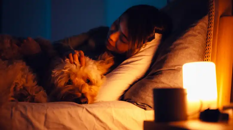 Dogs thrive on routine. With your dog, this schedule might involve greeting you when you come home every evening before snuggling up beside you or in their bed on the floor every night. Changing that routine by suddenly not showing up for bedtime could lead your canine companion to believe you've abandoned it and become anxious. This can lead to behavioral issues; dogs with nighttime separation anxiety have a tendency to whine, howl, bark, urinate or defecate, or scratch at doors as they await their owner's return.