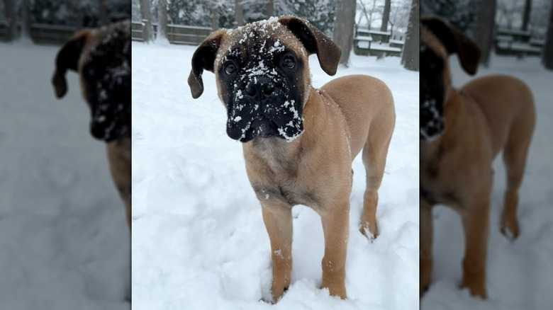 When he's not playing with snow or toys or running around inside, Fonzee has been practicing his guarding skills in the backyard recently. The bullmastiff is one of the best protective dog breeds to help you feel safe, according to pet parents, so as he grows and gets bigger, he'll likely become a great guard dog for his mom. He just might learn to ring the bell to alert his mom that someone's at the front door, not just when he needs to go out.