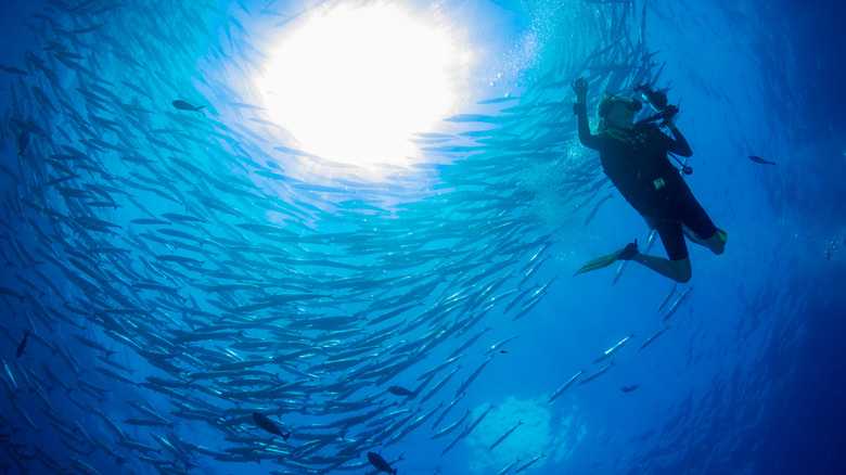 A visit from a shark or a stingray is almost guaranteed for those diving into the sea waters near Sipadan Island. For those intrigued by the ocean's other sea life, divers can also expect to find themselves in the middle of a tornado of barracuda or swimming alongside a parade of bumphead parrotfish. Rarer sightings, such as the appearance of a scalloped hammerhead shark, ensure that every dive into the deep is a new experience.